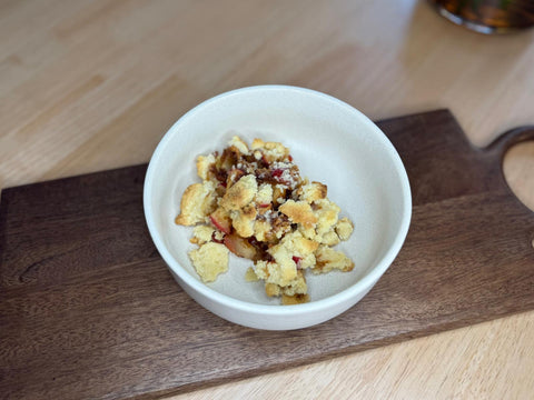2. Crumble-Topping zubereiten: In einer Schüssel Butter, Mehl und Zucker vermengen, bis eine krümelige, leicht klebrige Masse entsteht.