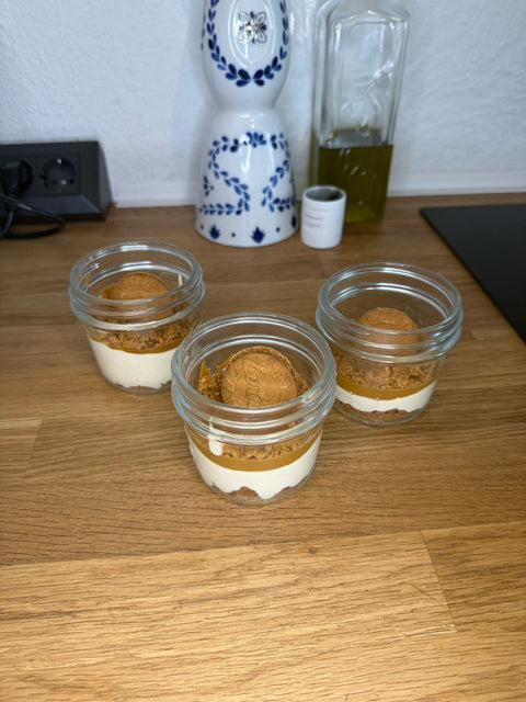 Biscoff Vanilla Kekse zerkleinern und mit geschmolzener Butter vermengen. Die Mischung in Dessertgläsern verteilen und leicht andrücken.