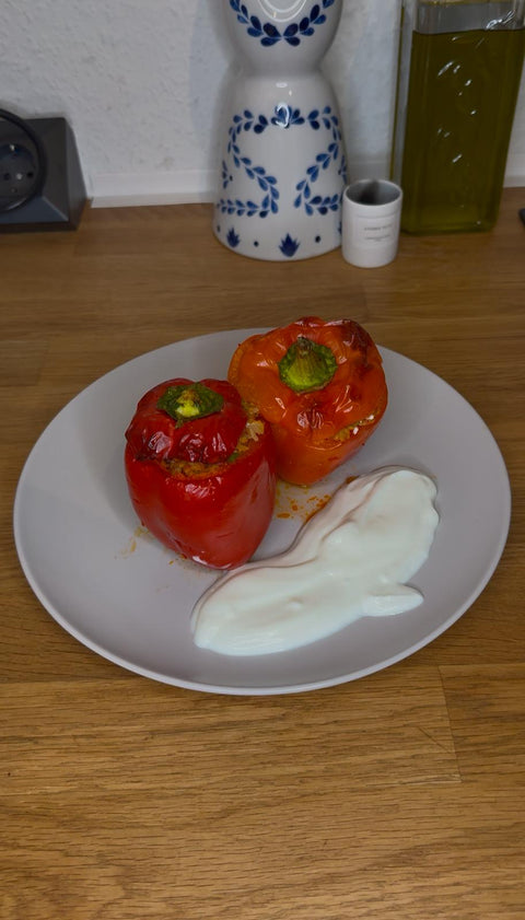 5. Servieren: Die gefüllten Paprikas aus dem Ofen nehmen und heiß servieren. Optional mit einem Klecks Joghurt garnieren.