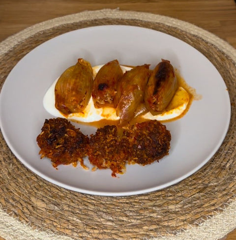 Dieses Gericht vereint die herzhafte Würze von traditionellen Köfte mit der zarten Süße von gefüllten Zwiebeln. Die saftigen Hackfleischbällchen, aromatisch gewürzt mit Kräutern und Gewürzen, werden perfekt ergänzt durch die weichen, geschmorten Zwiebeln, die mit einer würzigen Mischung aus Hackfleisch, Reis oder Bulgur und Gewürzen gefüllt sind.
